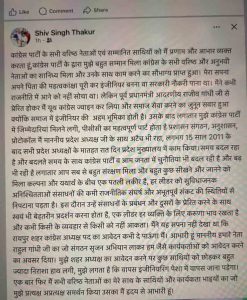 शिव सिंह ठाकुर रायपुर शहर कांग्रेस अध्यक्ष पद के संगठन सृजन अभियान के तहत दावेदारी कर रहे थे। हालांकि, पार्टी की ओर से अभी तक किसी भी नाम की आधिकारिक घोषणा नहीं हुई है। लेकिन ठाकुर के इस तीखे रुख से साफ है कि वे पार्टी के संभावित फैसले से नाखुश हैं और उन्हें अपने खिलाफ निर्णय की आशंका है।